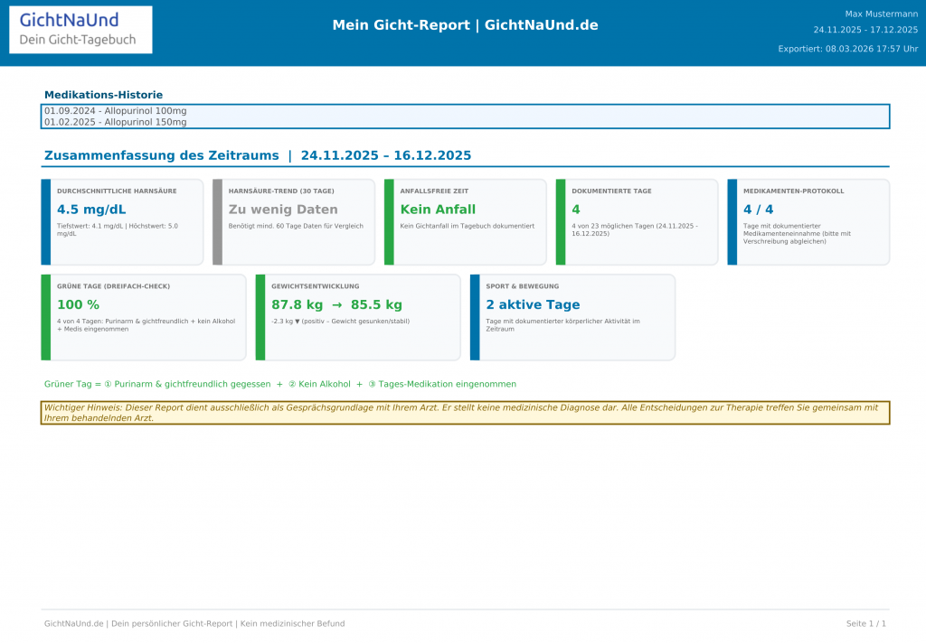 Ein Klick. Ein professioneller PDF-Report. Harnsäure-Verlauf, Medikations-Historie, Grüne Tage – alles drin, alles auf einen Blick. Schluss mit dem Gefühl, beim Arzt von vorne erklären zu müssen.