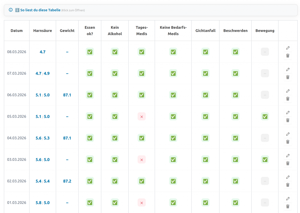 Kein Raten mehr. Kein Schulterzucken beim Arzt. GichtNaUnd trackt täglich deine Harnsäure, dein Gewicht und deinen Lebensstil – und zeigt dir schwarz auf weiß, was wirklich passiert.
