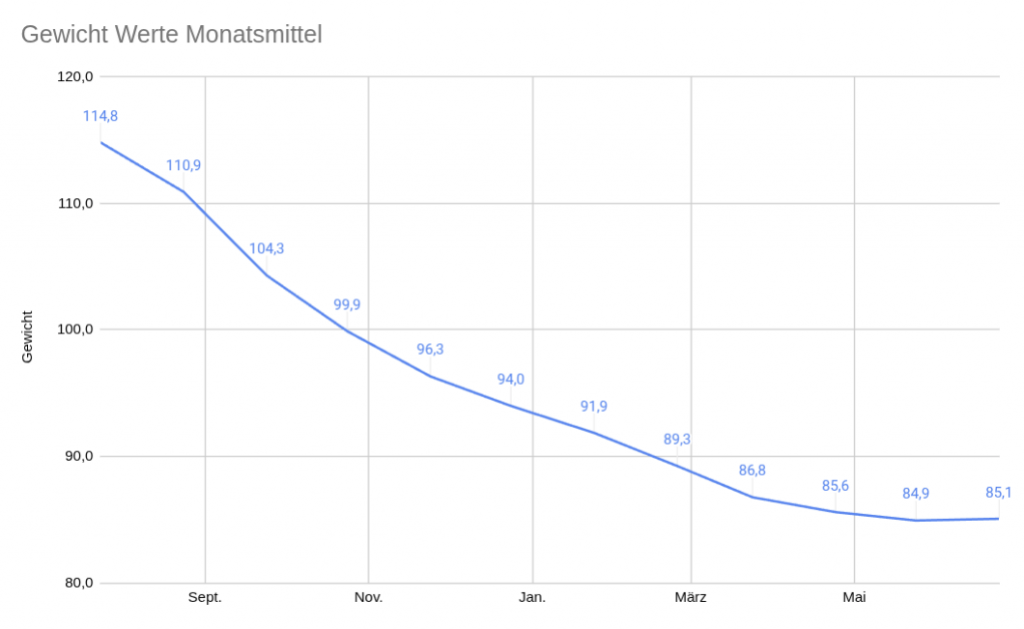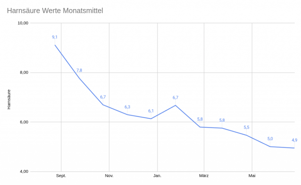 Der Knick ab September? Start der Therapie & Tracking. Rückschlag im Dezember/Januar. Seitdem stabil unter 6 mg/dl.